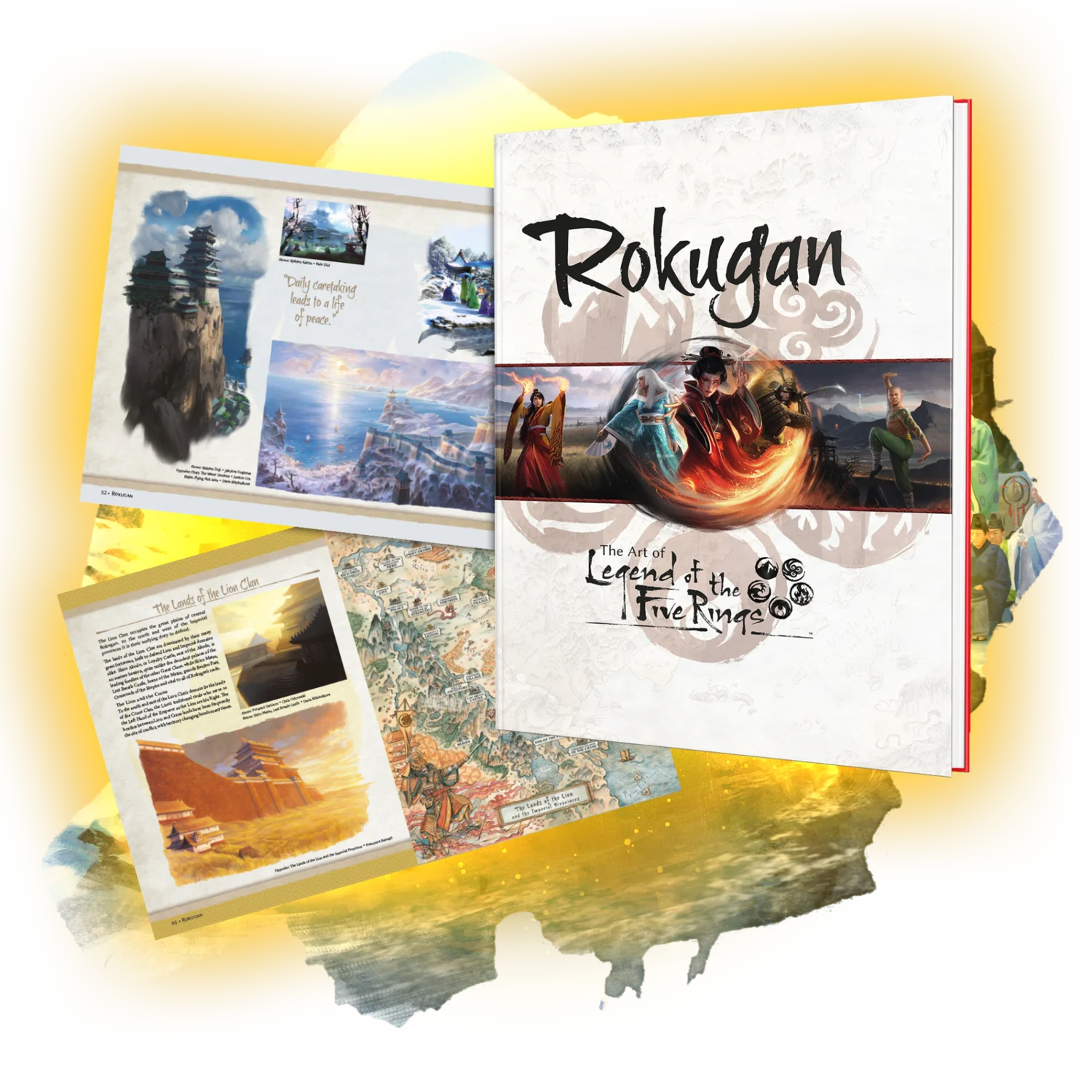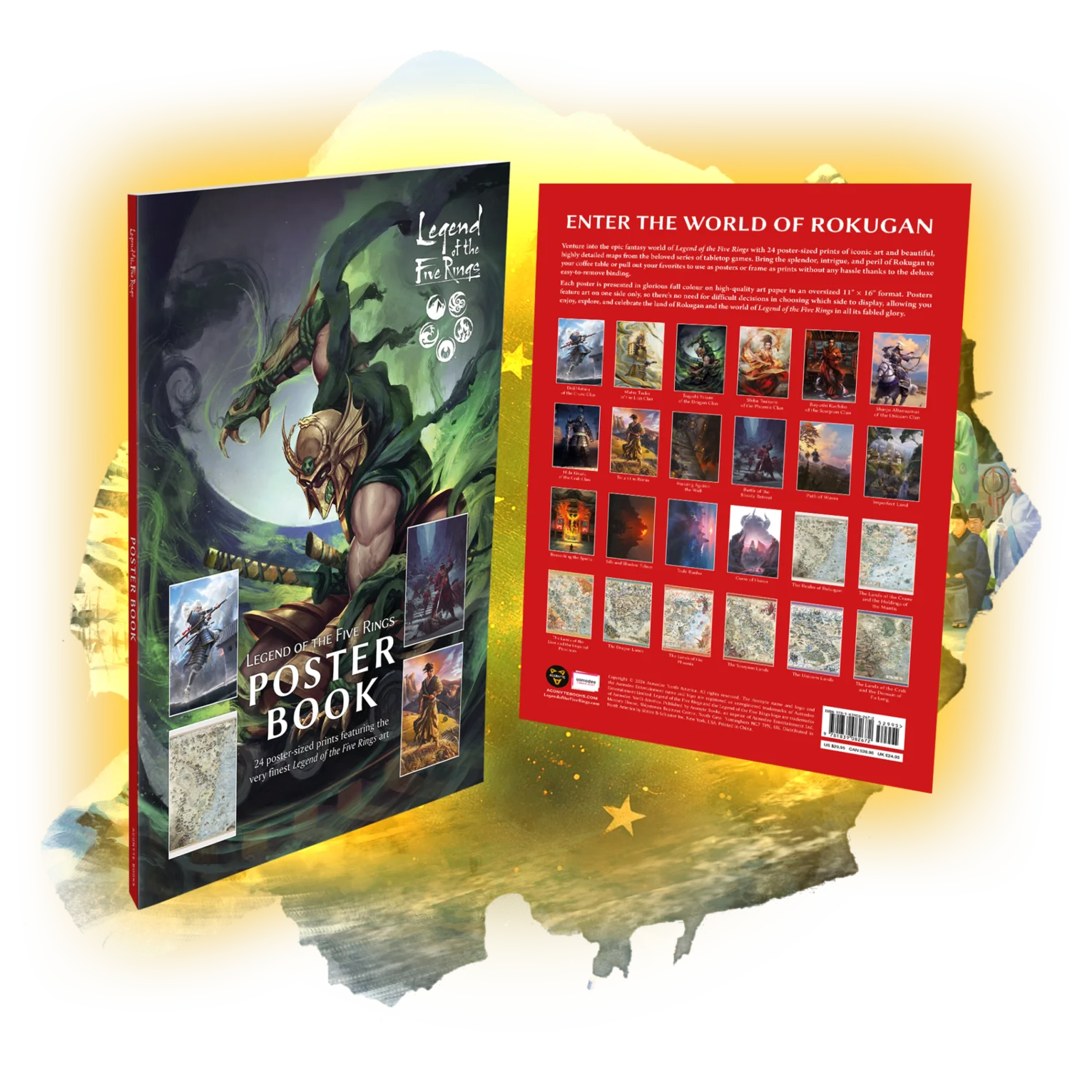 The Legend of the Five Rings Poster Book collects twenty-four breathtaking art pieces for L5R fans and lovers of fantasy art to savor or pull out as posters measuring roughly 11” x 15.75”. Subjects of the art include many of the great leaders, warriors, and spiritual characters from the games, as well as iconic maps, landscapes, and architecture of the Emerald Empire.