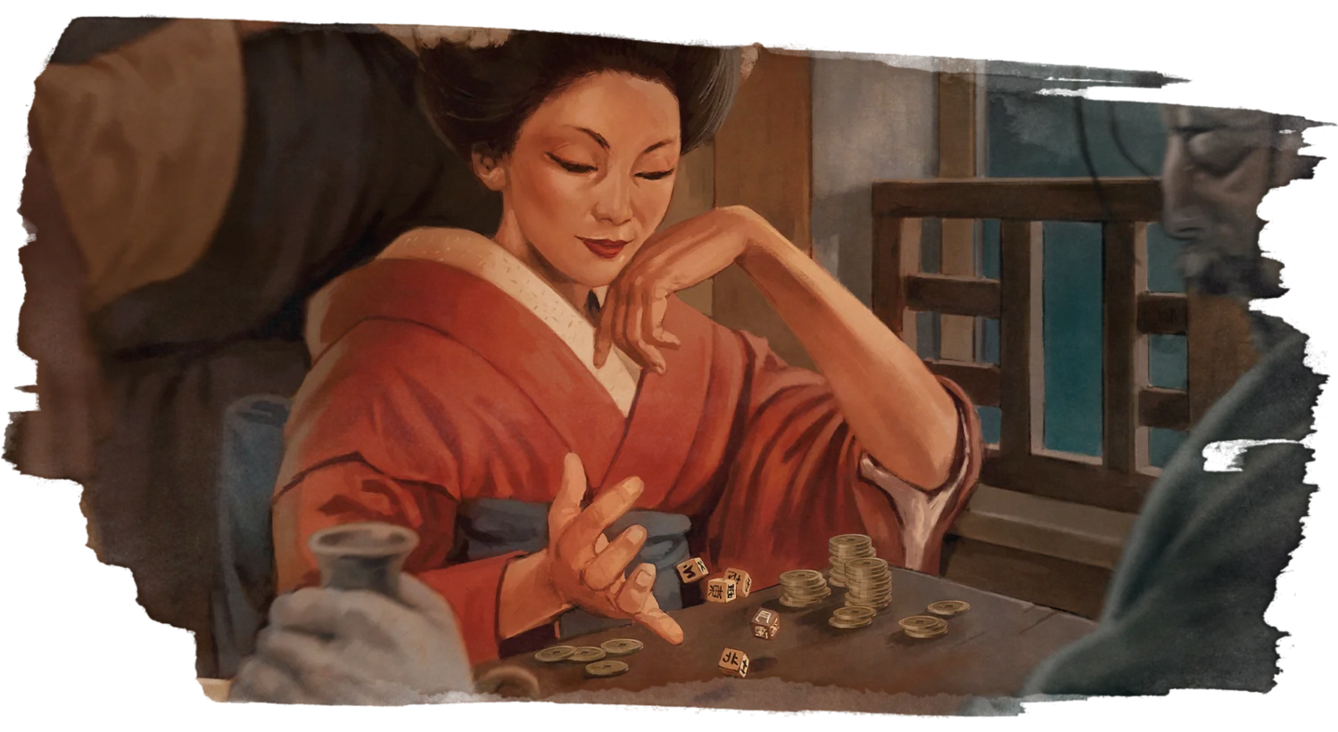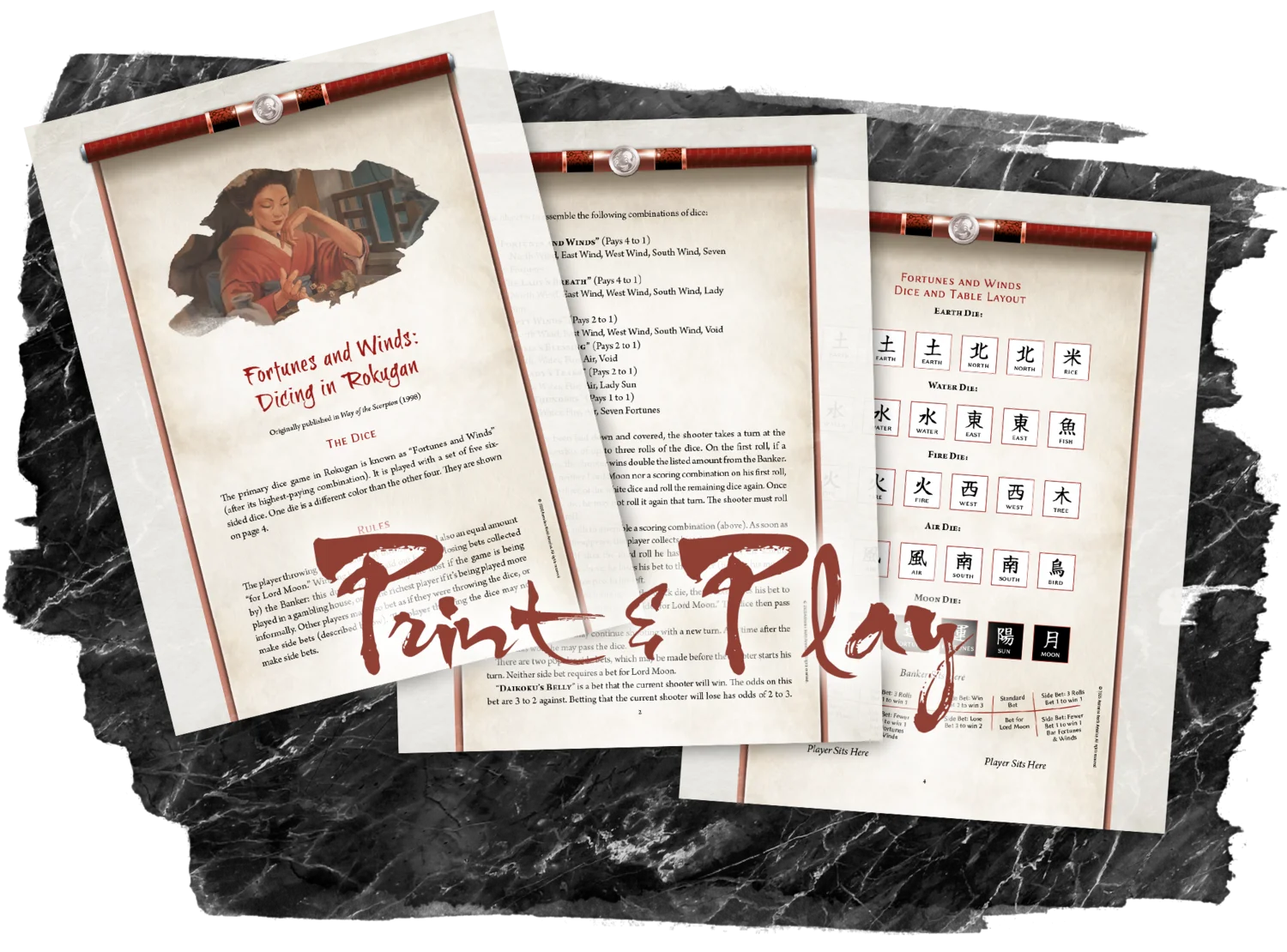 The beloved dice game known as “Fortunes and Winds” comes from the sake and gambling houses of Rokugan to your gaming table with these free rules and dice labels. Originally published in the 1998 L5R RPG sourcebook Way of the Scorpion, we’re making these rules available again to all as part of the celebrations for L5R’s 30th anniversary. You can also get a behind-the-scenes look at the creation of the rules for this game in Episode 3 of the “30 Years of Legend of the Five Rings” podcast featuring special guest D.J. Trindle.